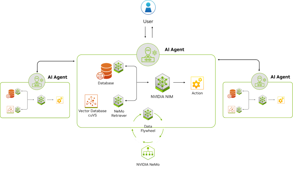 Flow of AI agent interacting with data sources & external tools, with memory and action components (Source: NVIDIA)