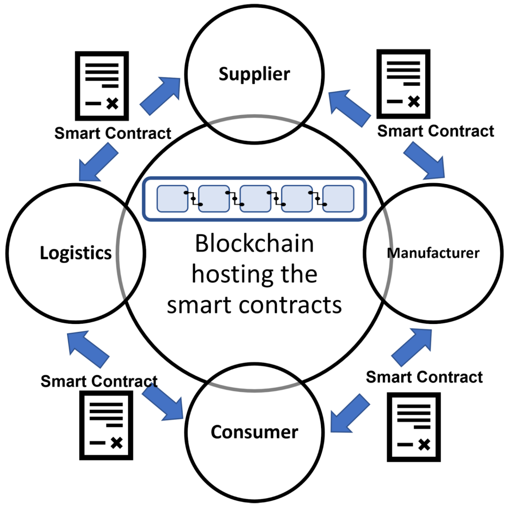 Smart contract architecture for logistics / supply chain: illustrating contracts, stakeholders, and automated triggers (Source: MDPI)