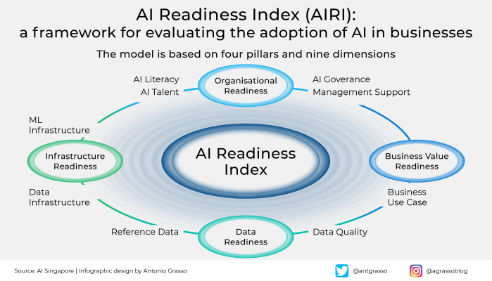 AI Readiness Index (AIRI) framework illustrating organizational, data, infrastructure and business readiness dimensions (Source: AI Singapore)