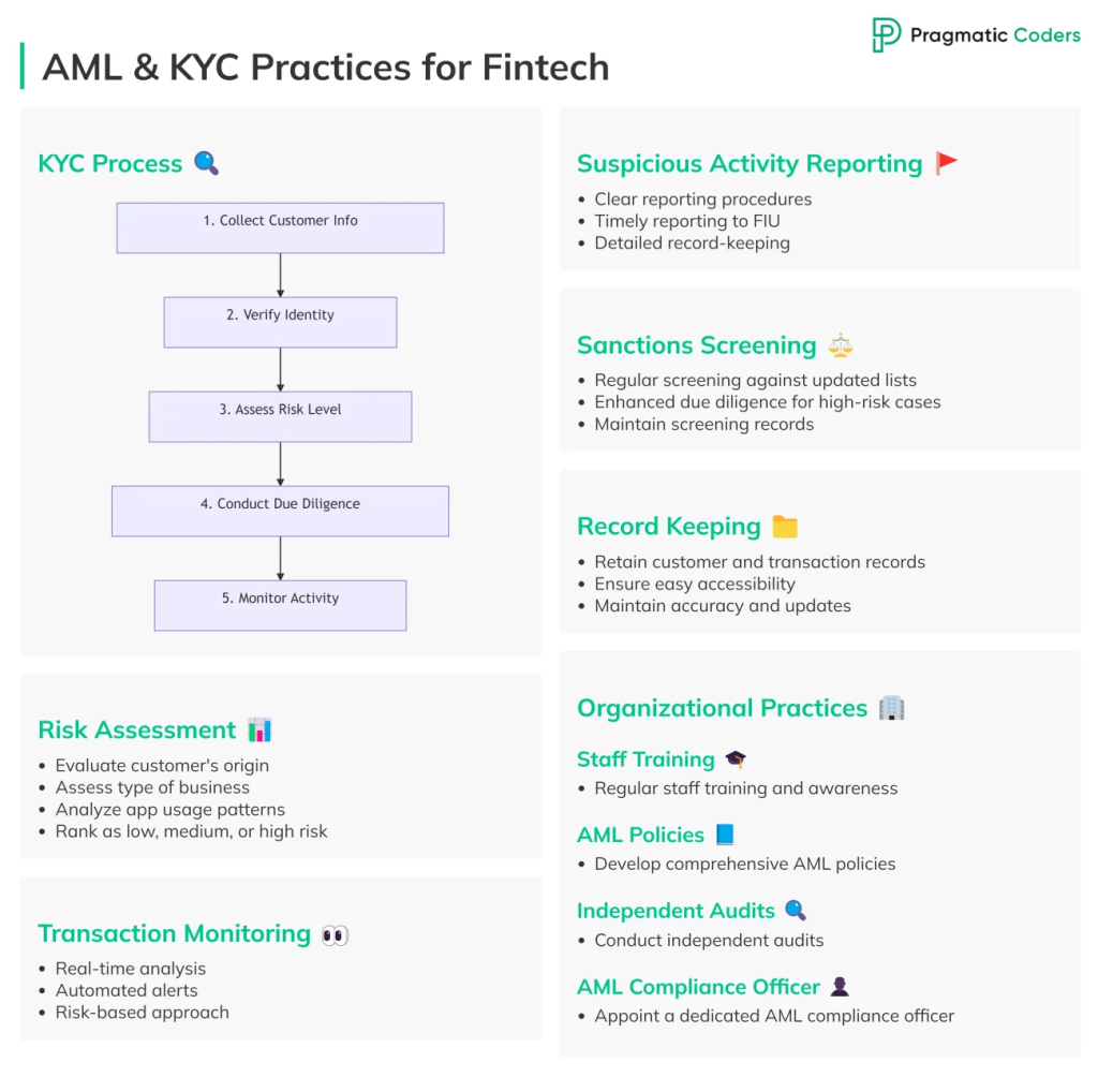 AML & KYC framework covering KYC process, risk assessment, transaction monitoring, and reporting (Source: Pragmatic Coders).