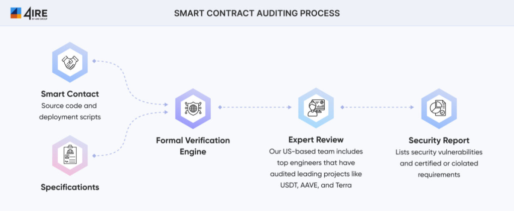 Smart contract auditing process highlighting verification, expert review, and security reporting (Source: 4IRE Group)