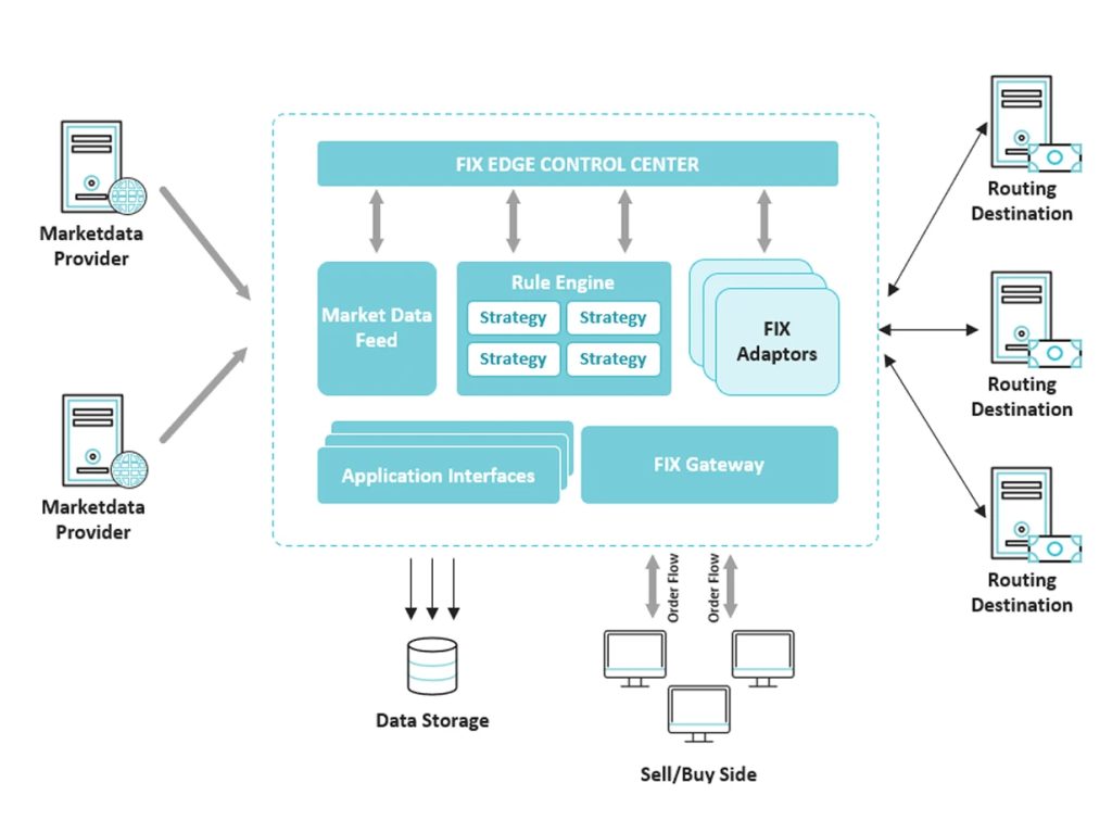 Liquidity integration architecture illustrating how market data feeds, FIX engines, and routing destinations connect to support real-time order flow and market making (Source: FIX protocol liquidity workflow diagram)