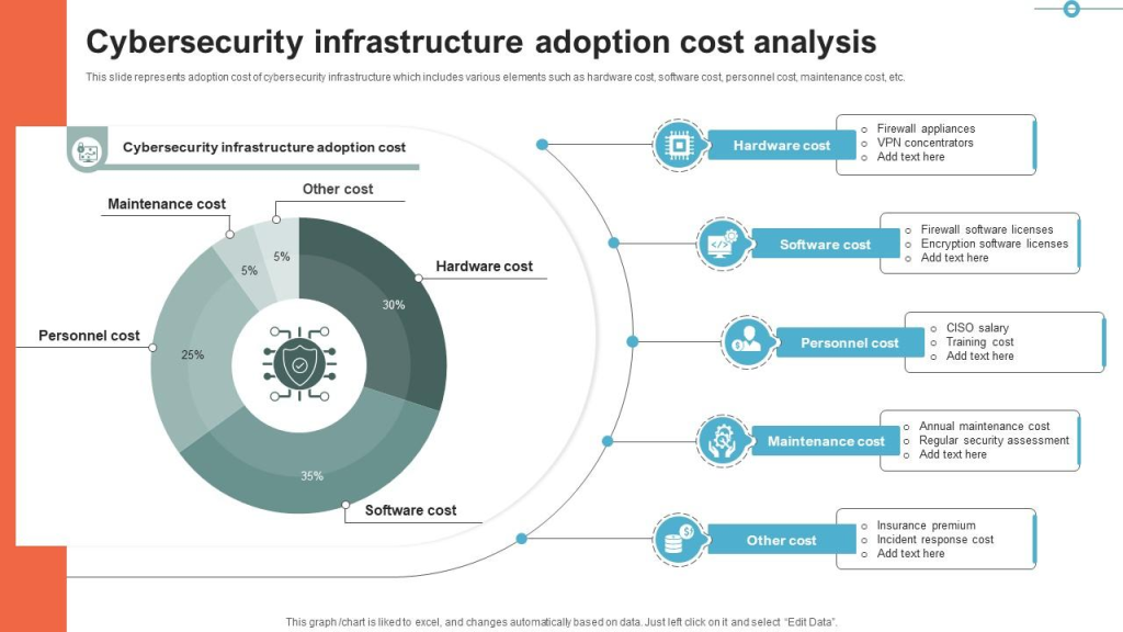 Cybersecurity infrastructure adoption cost analysis, illustrating how hardware, software, personnel and maintenance drive total security expenditure (Source: Internal slide)