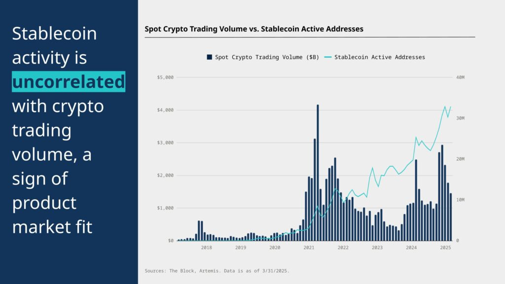 Stablecoin activity is uncoupled from crypto trading, proving they are used as money, not just speculation. (Source: a16z crypto)