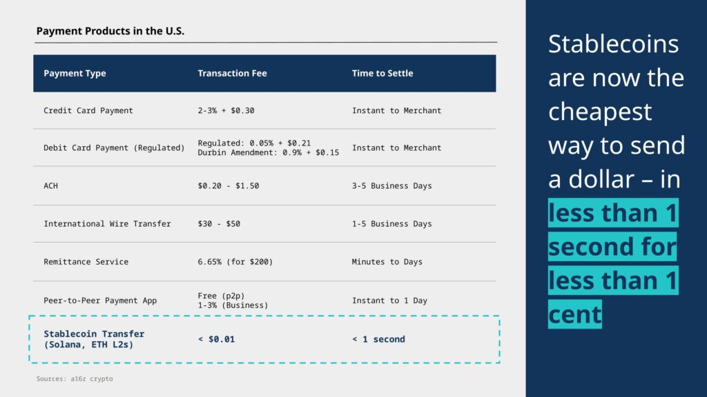 Stablecoin transfers settle in <1 second for <$0.01 far below the cost and latency of legacy payment rails. (Source: a16z crypto)