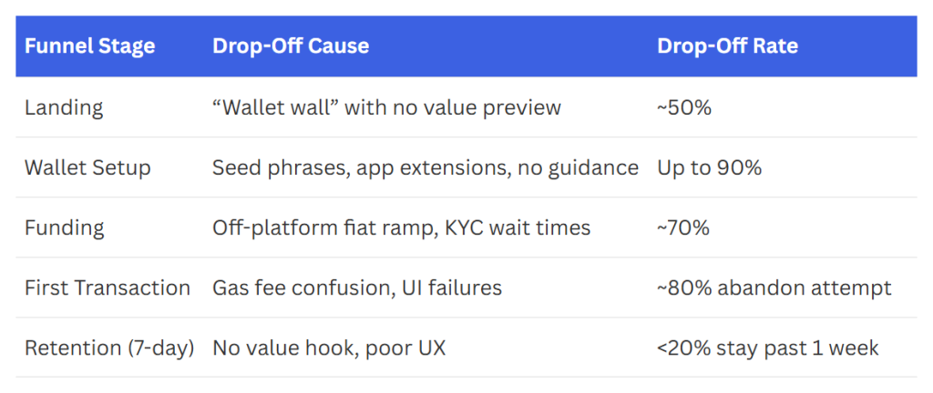 Drop-off rates across the Web3 onboarding funnel highlight why user retention remains a challenge stablecoins help compress these failure points into a seamless, fiat-like experience. (Source: ICODA Agency – Medium)