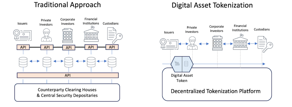Illustration of real-world assets (real estate, debt, art) moving into tokenized form (Source: Avax)