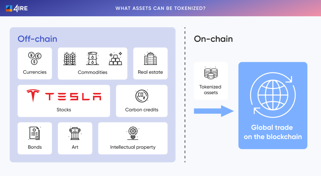 Infographic of “what assets can be tokenized” including real estate, commodities, art, carbon credits, … (Source: ire4labs)