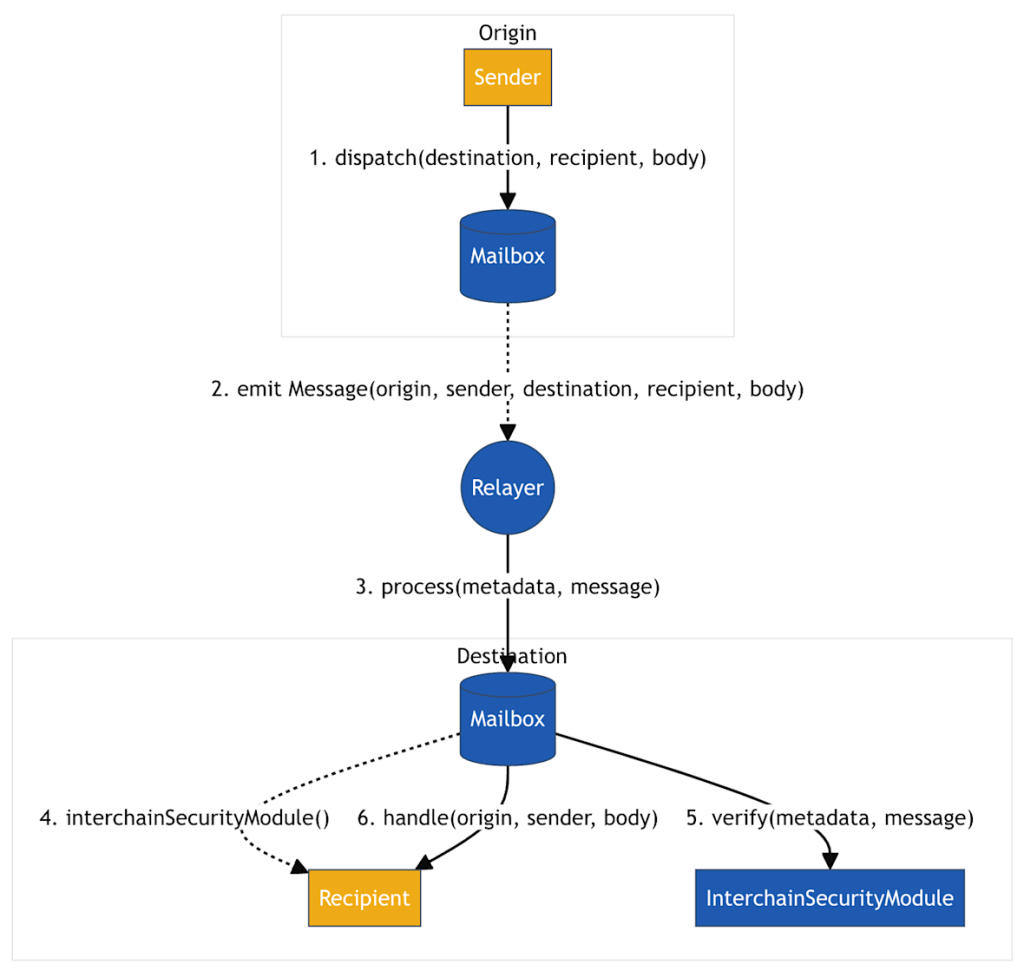 This diagram illustrates the cross-chain interoperability messaging flow in Hyperlane (Source: Coinbase)