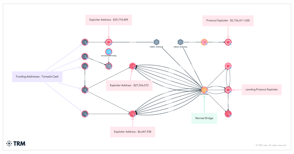 Visualization of on-chain fund flows showing how Tornado Cash–funded exploiter addresses laundered assets through Nomad Bridge and other protocols (Source: TRM Labs)