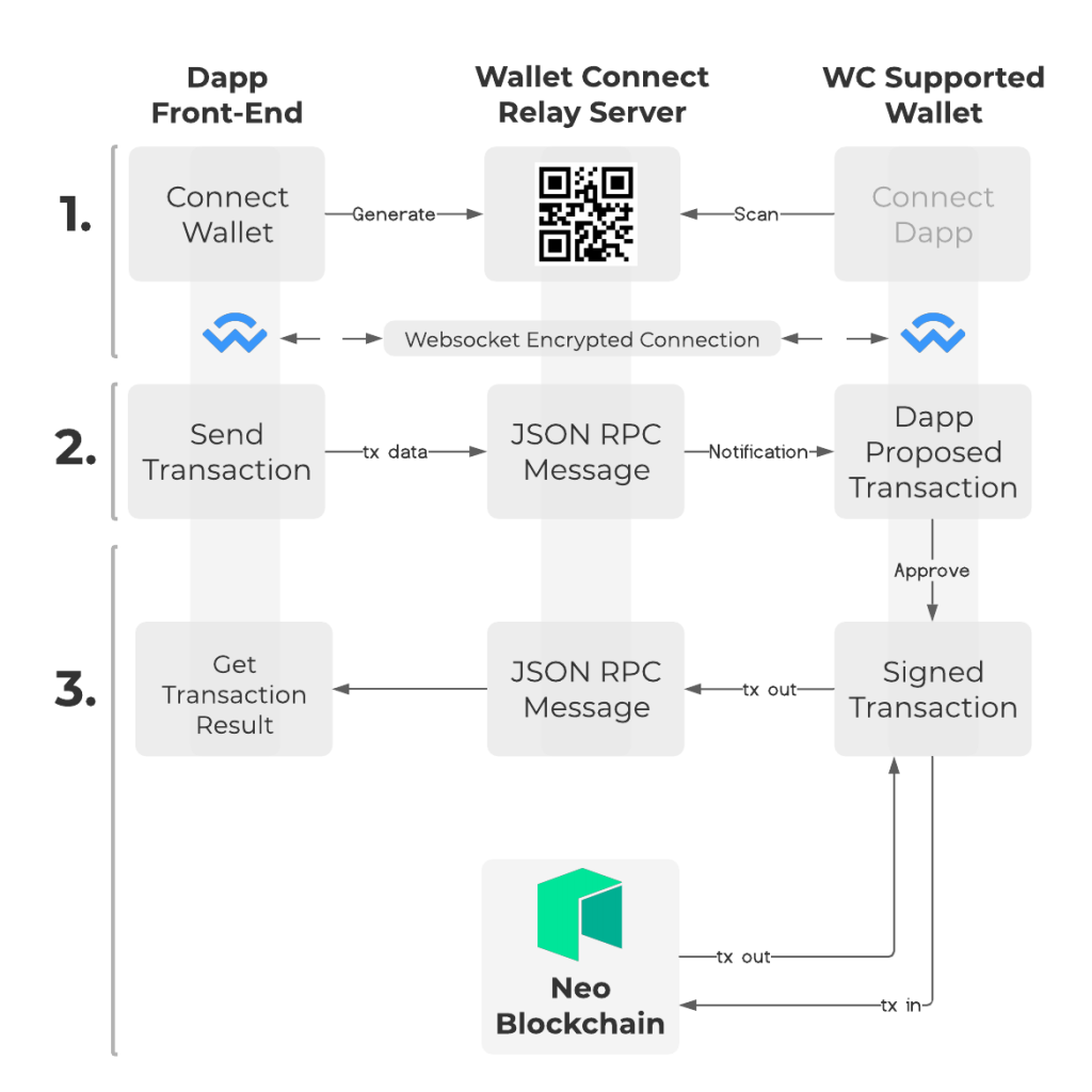 Wallet-connect architecture flow: frontend “miniapp” connects to wallet via relay server, transaction requests handled through RPC, and signed transactions return to miniapp (Source: Neo Blockchain)