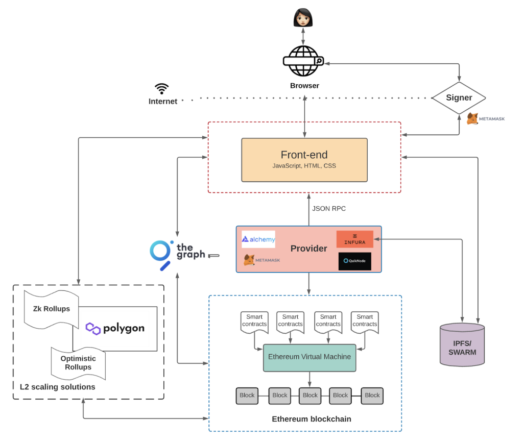 Diagram showing Web3 front-end interacting with wallet provider, blockchain nodes, and metadata services – illustrating embedded wallet-native interactions (Source: thenewstack)