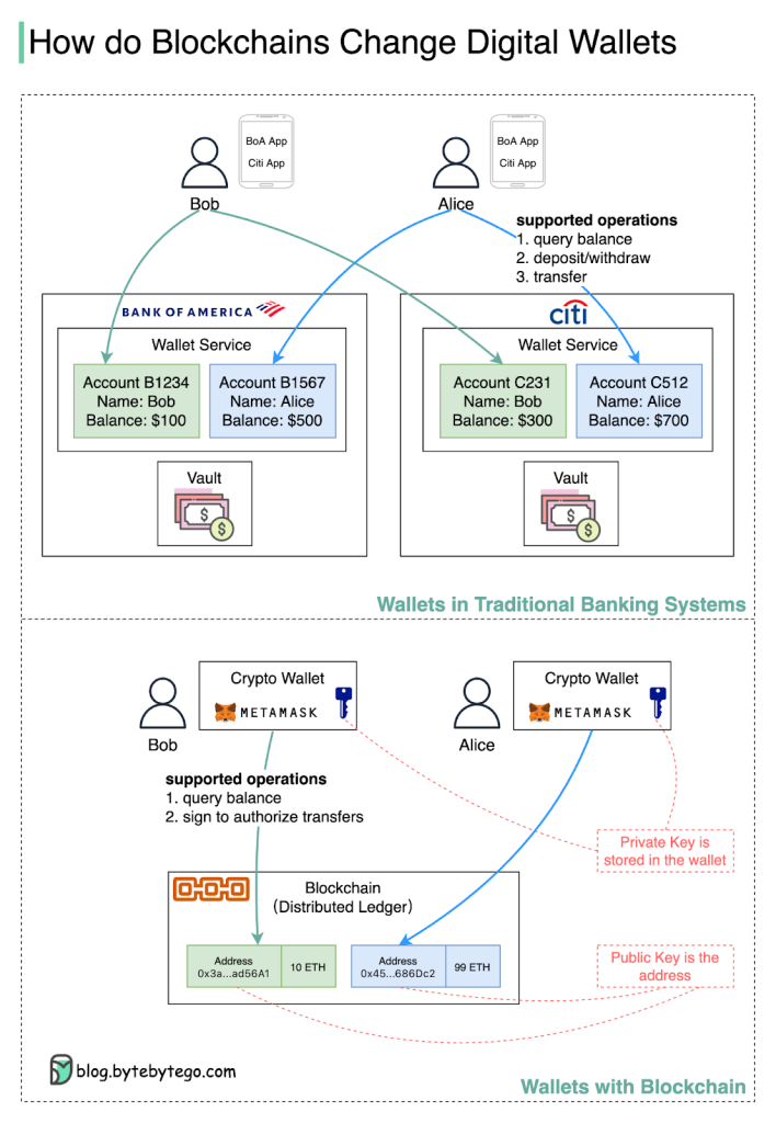 Diagram comparing digital wallet behaviour in traditional banking vs. blockchain wallets, illustrating how wallet-services manage accounts, transactions, and vaults differently in Web3 (Source: ByteByteGo)